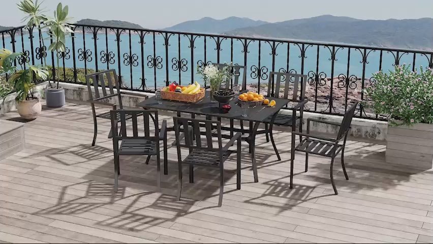Black Metal 7 Piece Garden Dining Set With Umbrella Hole & Table Plus Stackable Chairs