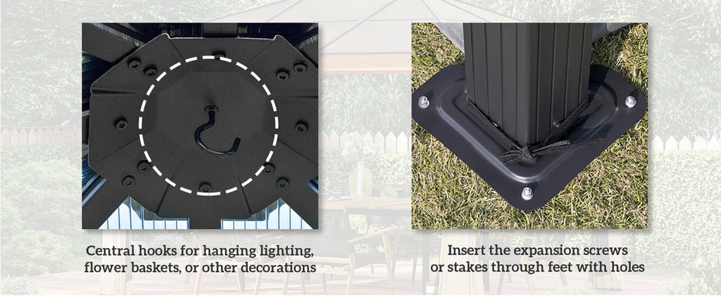 - Includes 12 ground stakes and 8 expansion screws for added stability