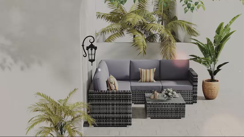 Black 4-Seater Rattan Sofa Set With Coffee Table and Cushion Pillows