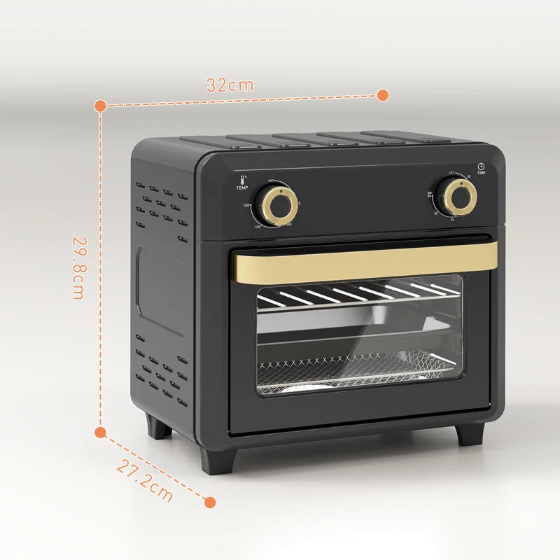 - Dimensions: 32W x 27.2D x 29.8Hcm. Includes a fry basket, oven rack, baking pan, tray handle, and crumb tray, all dishwasher safe for effortless cleaning. Free from PFOA and BPA.