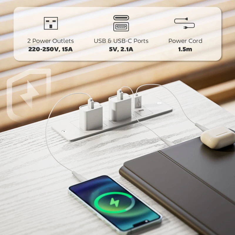 - Stay charged and productive: This computer desk features a built-in charging station with two power outlets, two USB ports, and a 1.5 m power cord, eliminating the need to search for available sockets.