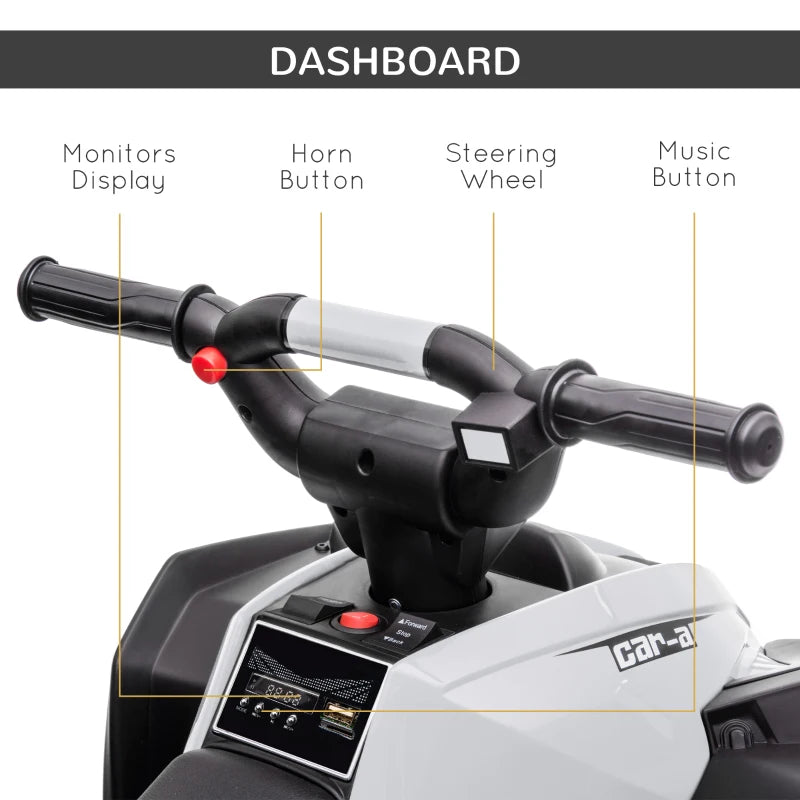 Embark on an exciting four-wheeled journey with this kids ATV. Tailored for children aged 3–5 years, it offers up to 45 minutes of uninterrupted fun on a full 8–12-hour charge. With speed options of 3km/h or 6km/h, it provides a safe yet exhilarating experience for young riders. They can honk the horn, turn on the headlights, and enjoy built-in music – just like a real vehicle. The spacious seat ensures comfort, while the textured tires guarantee smooth rides on any terrain. A delightful way to inspire creativity and outdoor enjoyment!