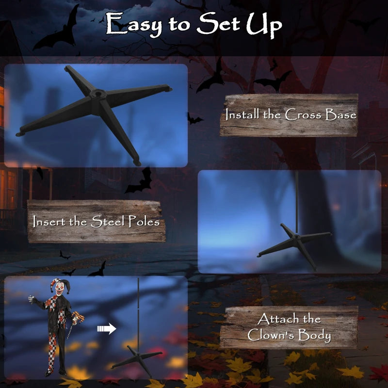 - Sound-activated movement: The Halloween clown's head and arms sway back and forth in response to sound, accompanied by a playful, eerie clown voice. Its bendable arms allow for customizable poses, enhancing the spooky atmosphere.