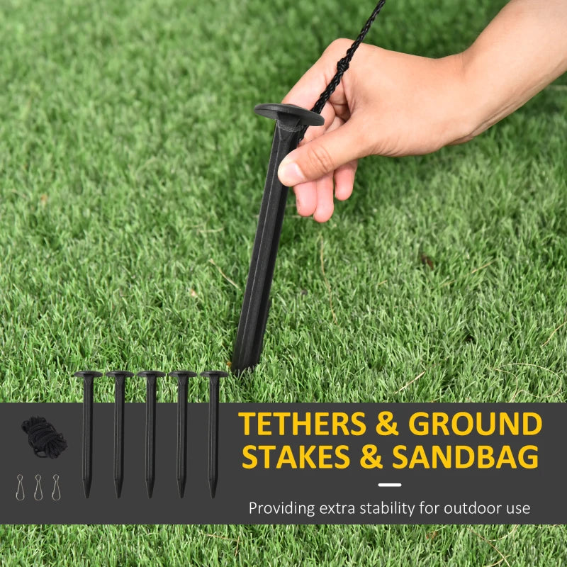 - Includes 5 ground stakes, 3 guy ropes, and 1 sandbag