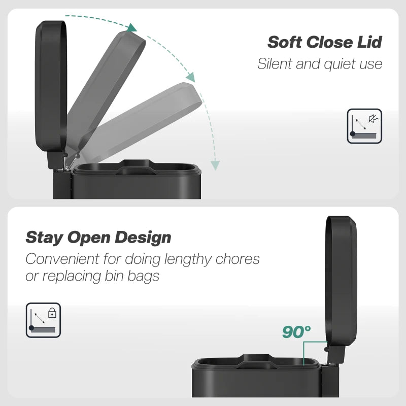- Pedal-operated, soft-close lid: Just press the pedal to open the lid of this trash bin. It closes gently to avoid disturbing your household.