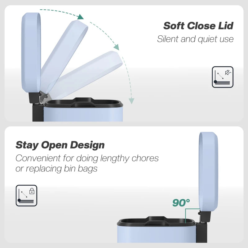 - Pedal-operated, soft-close lid: Just press the pedal to open the lid of this trash can. It closes gently to avoid disturbing your household.