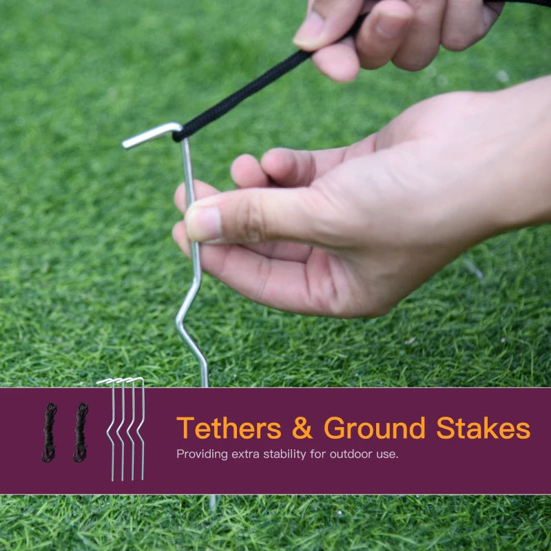 - Accessories: 7 ground stakes, 5 strings, 1 inflator fan, and 2 sandbags