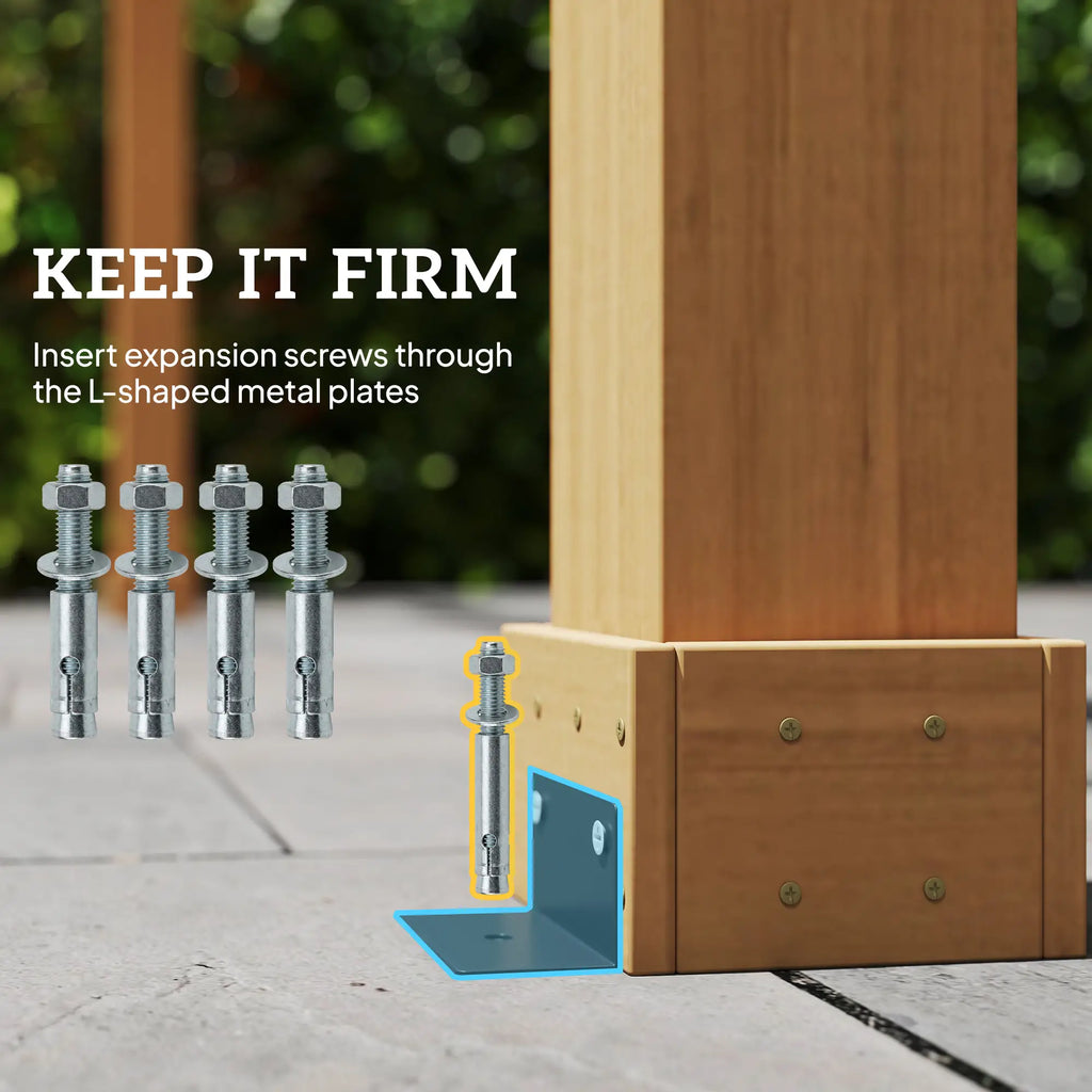 Supplied with expansion screws and L-shaped metal plates, allowing you to anchor the pergola firmly to hard ground surfaces for added safety and durability. -