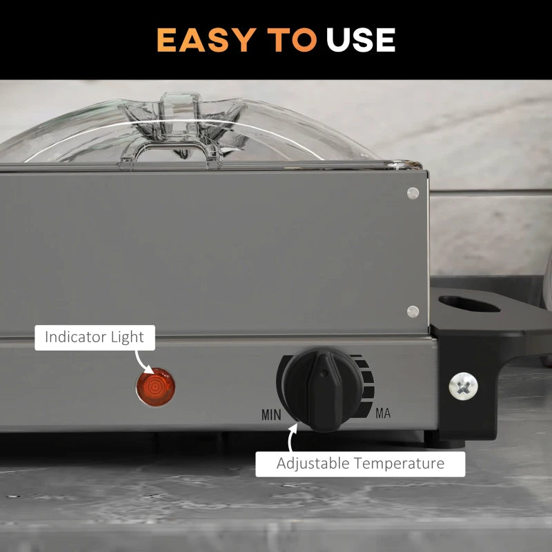 Elevate your party food experience with this electric buffet warming tray, ensuring your guests enjoy warm, delicious food throughout the event. Crafted from durable stainless steel, it effectively retains heat. The adjustable temperature range of 58°C-85°C allows you to customize the heat for various dishes. It comes with 2x 1L trays and 2x 2.4L trays, providing four sections for different foods, all covered with clear lids to keep them warm. The unit features cool-touch handles for safe transport.