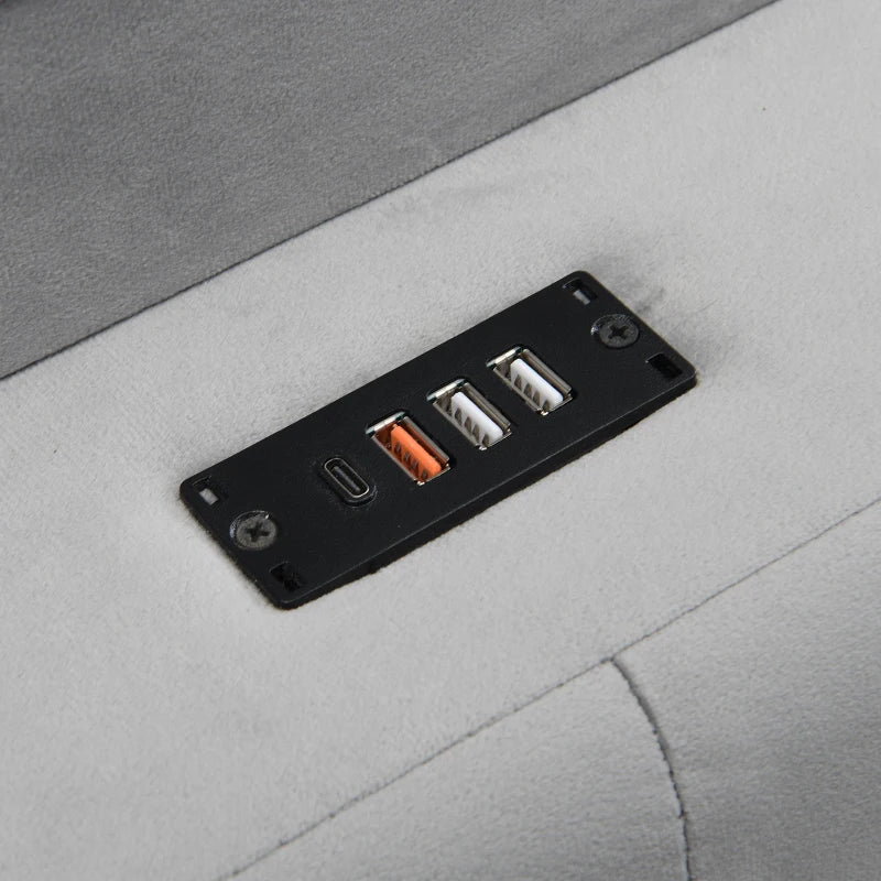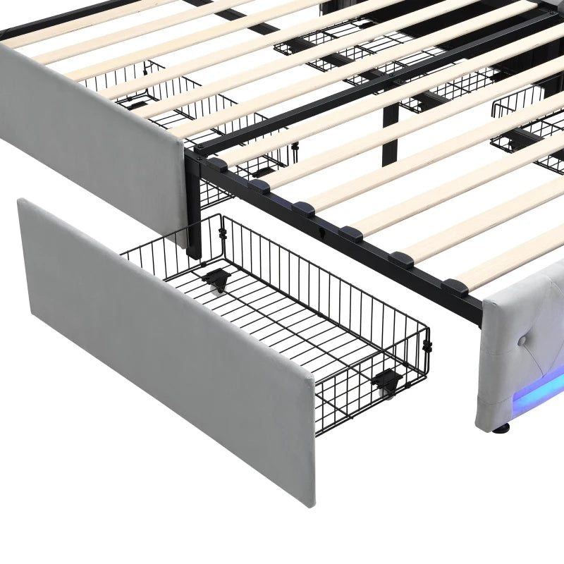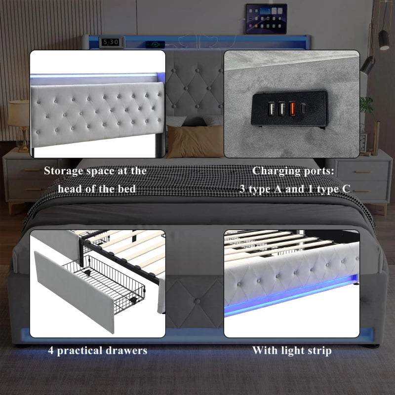 Transform your bedroom into a chic retreat with this grey velvet upholstered bed, suitable for both adults and teenagers. With dimensions of 206L x 143W x 115H cm, it features a plush headboard with built-in charging sockets to keep your devices charged. The bed is adorned with stunning LED light strips that can be customized to reflect your mood, and four spacious drawers on castors offer plenty of storage for your essentials. Made from high-quality materials, this bed blends modern sophistication with functionality, making it an essential addition to any contemporary home.