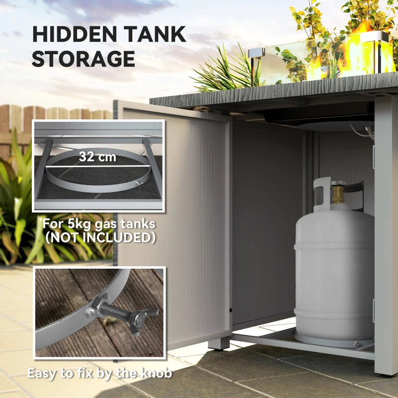 - Gas-powered: The outdoor fire table operates on a standard 5kg gas tank, which is stored in the bottom compartment.