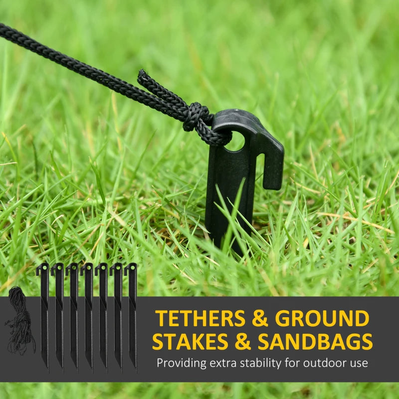 - Includes seven ground stakes, three guy ropes, and a sandbag for securing