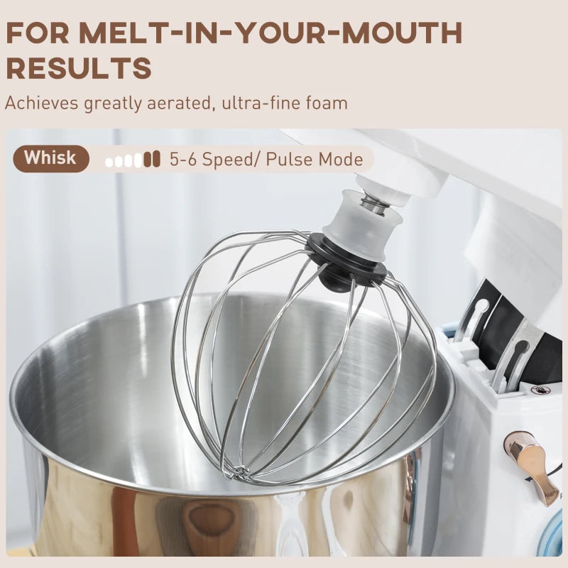 Discover your baking potential with the Stand Mixer for baking, featuring a powerful 1400W motor and a convenient six-speed setting plus pulse for perfect meringues. Its tilt-head design makes accessing the bowl easy, while the anti-slip base ensures stability. Complete with a 5L food-grade stainless steel bowl, this food mixer is the ideal companion for any cake mixer enthusiast.