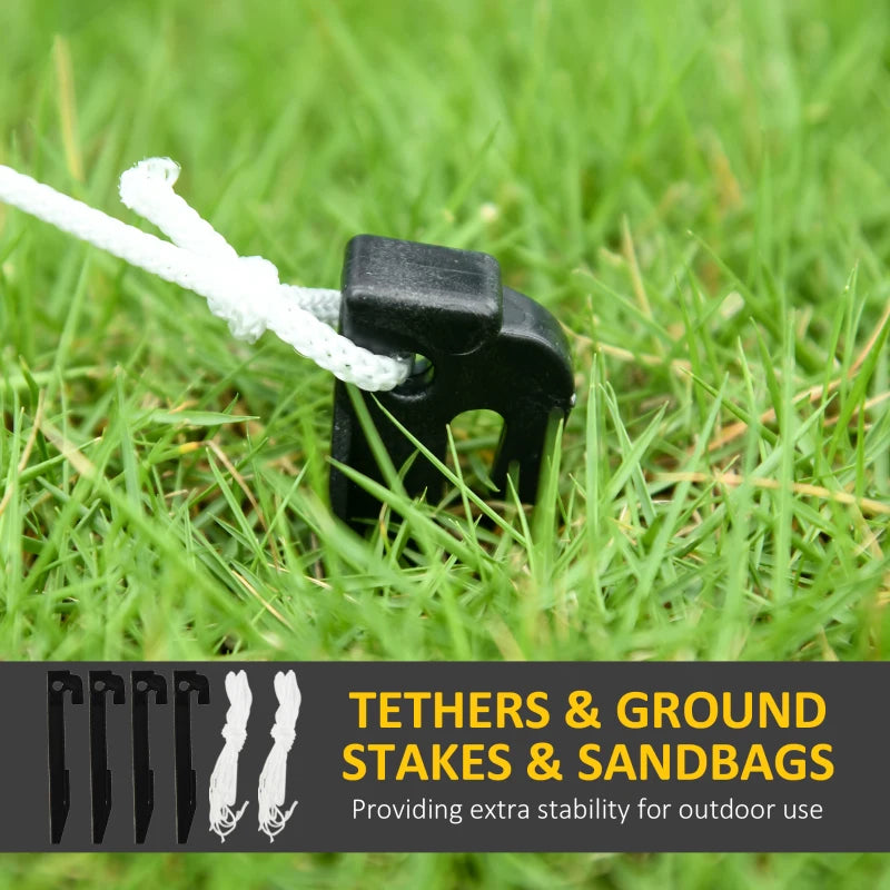 - Includes four ground stakes, two guy ropes, and a sandbag for stability