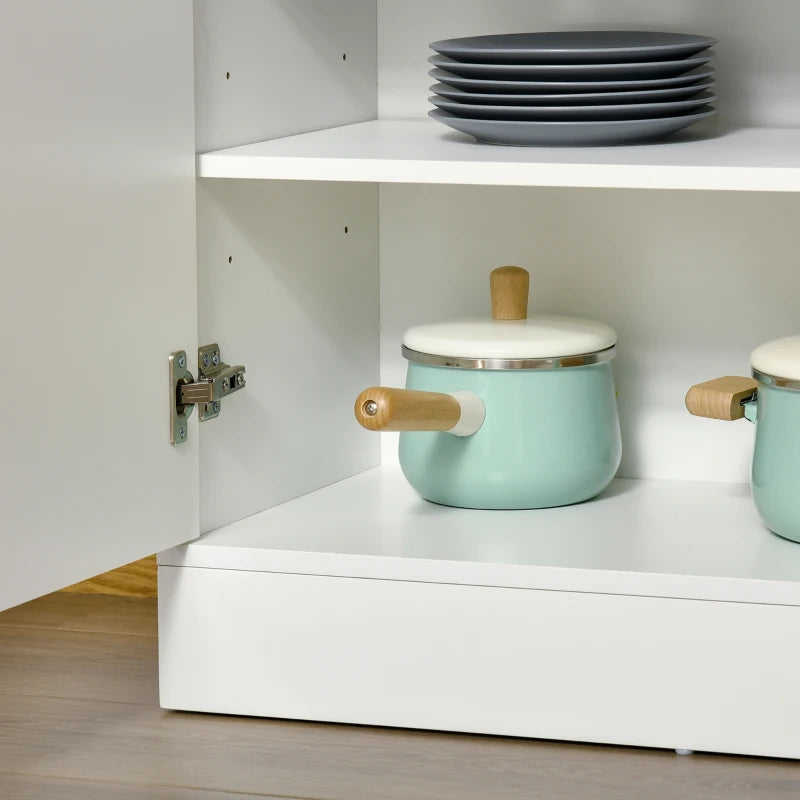 Two-part storage: Features three open shelves at the top and a lower cupboard with three internal shelves, offering ample space for plates, tins, pantry items, kitchen tools, cleaning products, and more.