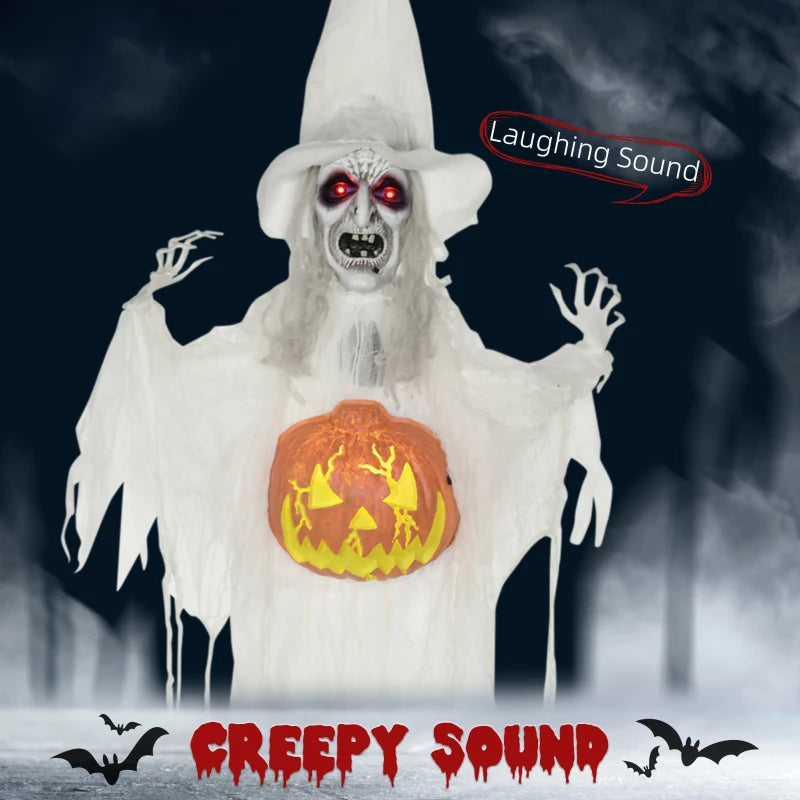 - Outdoor Halloween animatronics: When trick-or-treaters come near, she gazes into their souls with her haunting red glowing eyes and emits a creepy laugh, while her magical pumpkin shines with a warm yellow light.