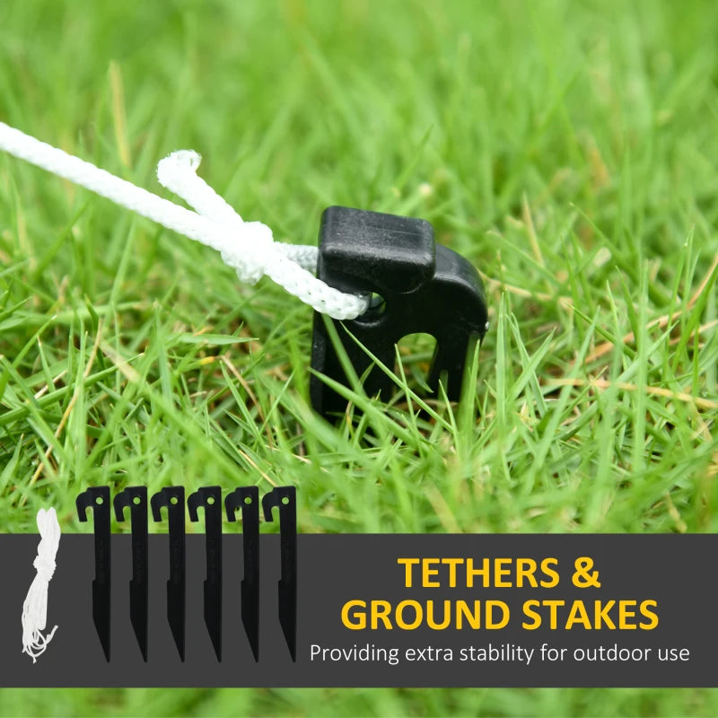 - Includes six ground stakes and two guy ropes for securing to the ground