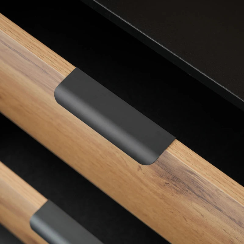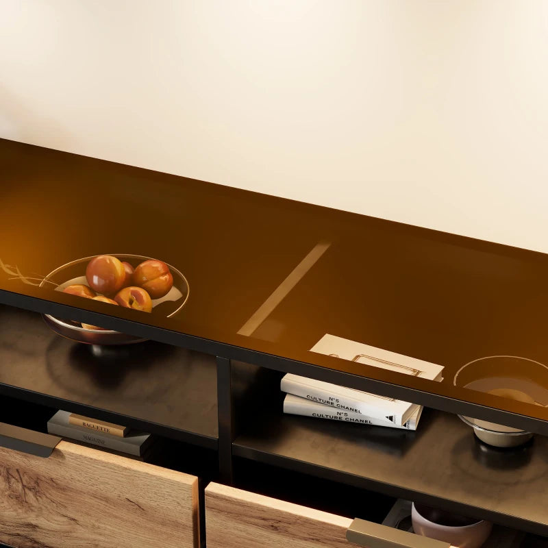 - Unique Design: This sideboard showcases wood veneer drawers paired with black matte panels, delivering a contemporary and premium look. The top features a brown glass surface, secured with suction cups for stability, and is easy to maintain, scratch-resistant, and long-lasting.