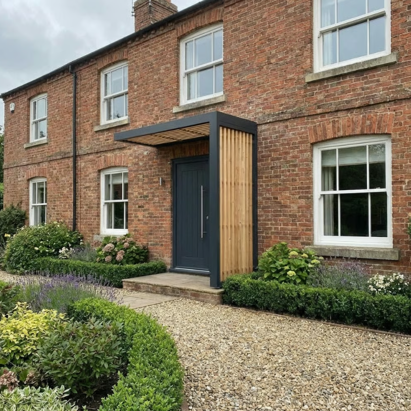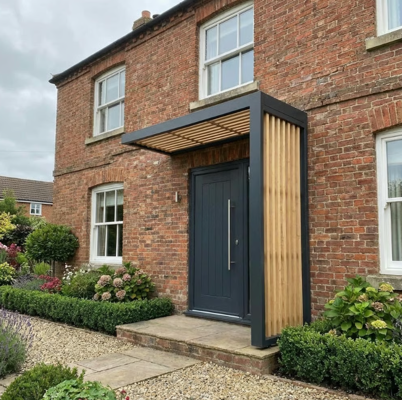Add a touch of elegance to your entrance with this German made BSTL160 Aluminium Timber-Line Canopy, a stunning blend of modern aluminium construction and natural timber accents.