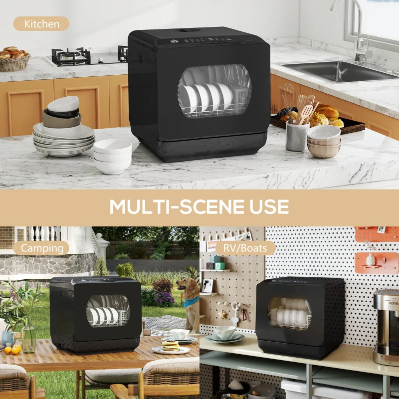 Say goodbye to the hassle of manual dishwashing, anywhere, with this HOMCOM tabletop dishwasher! It features six programs: intensive, efficient, normal, rapid, fruit wash and drying. The efficient spray arm ensures sparkling clean dishes every time. A compact dishwasher, suitable for four-person households.