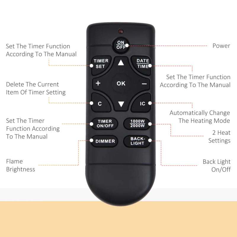 - Programmable Timer: Set your fireplace to turn on or off at specific times or days, with a maximum timing range of 23 hours and 50 minutes, for ultimate convenience and energy efficiency.