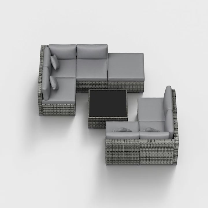 Chic Eight-Piece Rattan Set: Includes two corner chairs, four middle chairs, a footstool, and a coffee table. Arrange the pieces in any layout you prefer.