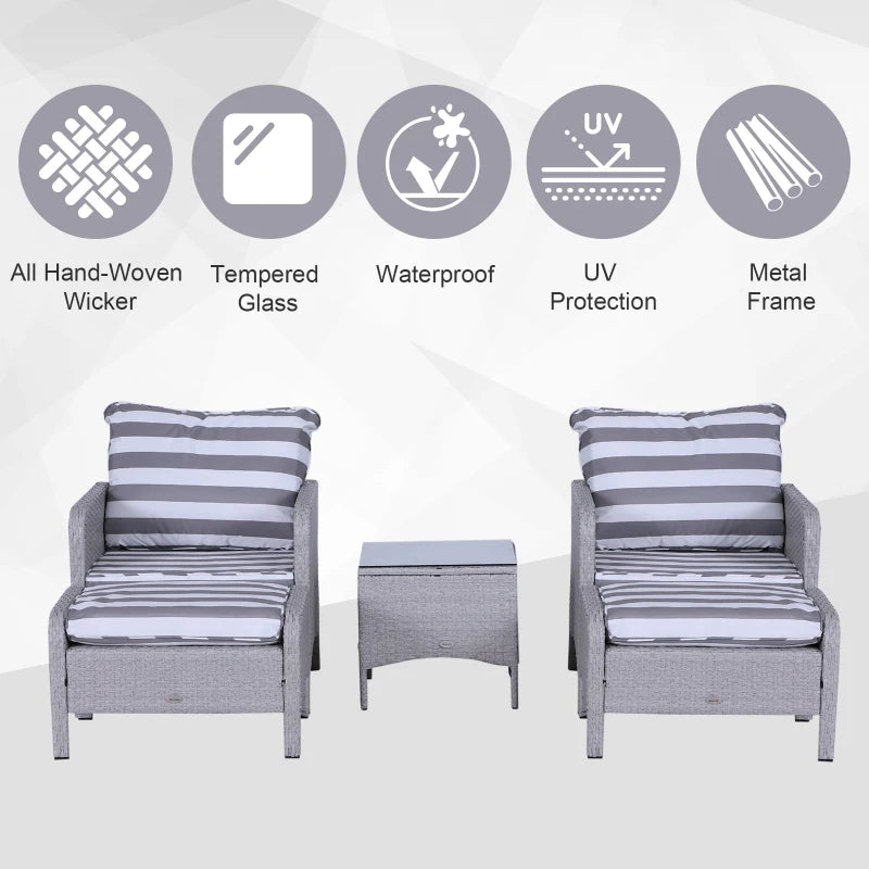 - Revitalize your outdoor space with this five-piece rattan sofa set, featuring two armchairs, two footstools, and a coffee table. An excellent addition to gardens, balconies, and various outdoor areas in your home.