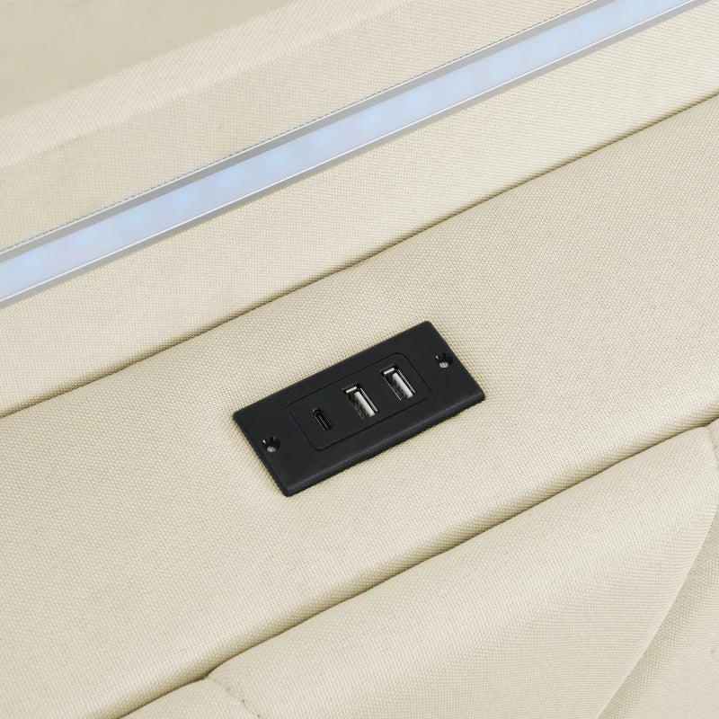 Transform your bedroom into a contemporary retreat with this 4ft6 double upholstered bed frame, featuring a stylish LED headboard with an integrated charging station. The headboard is fitted with RGB LED lights, allowing you to personalize the atmosphere to your preference, while the USB and Type-C ports keep your devices charged. With hydraulic storage beneath the bed and hidden compartments in the headboard, you'll have plenty of space to maintain a neat and organized room. Made from sturdy metal and wood, and covered in breathable linen, this bed combines style and comfort without the need for a box spring.