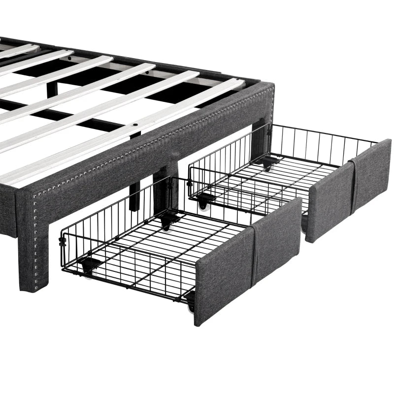 Transform your bedroom into a haven of style and functionality with this 4ft6 double upholstered bed, featuring two spacious storage drawers, headboard storage, and handy side pockets. The bed is equipped with Type-C and USB ports, ensuring your devices are always charged, while the soft LED night light creates a cosy atmosphere, perfect for drifting off to sleep. Crafted from a sturdy metal-wood frame and covered in wear-resistant linen, this bed offers both durability and a chic riveted design that complements any home decor. With easy assembly and no need for a box spring, this bed is a practical and stylish addition to any bedroom.