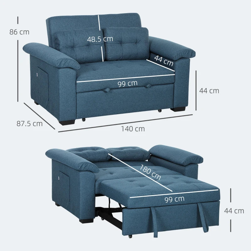 - Product dimensions: Loveseat sofa: 140W x 87.5D x 86H cm. Pull out bed: 99W x 180D x 44H cm. Overall weight capacity: 220 kg. 3-level adjustable backrest angle: 105°/155°/180°. Easy to assemble