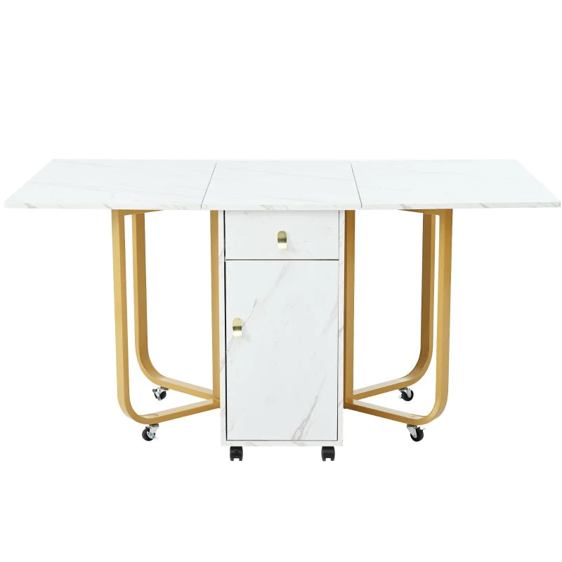 This folding dining table is a stylish and multifunctional addition to any home, offering three configurations to meet your requirements. Whether utilized as a desk, dining table, or storage cabinet, it can be easily customized for comfort and convenience. The table includes two drawers and a generous storage area, boosting its functionality, while the smooth drawer runners provide a pleasant user experience. With a weight capacity of 60kg and elegant gold-plated handles, this table merges practicality with a touch of luxury.