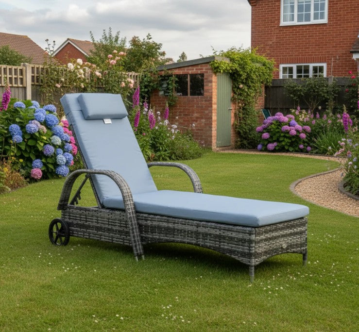 - Rattan sun lounger hand-woven with durable PE wicker that is UV and weather resistant.