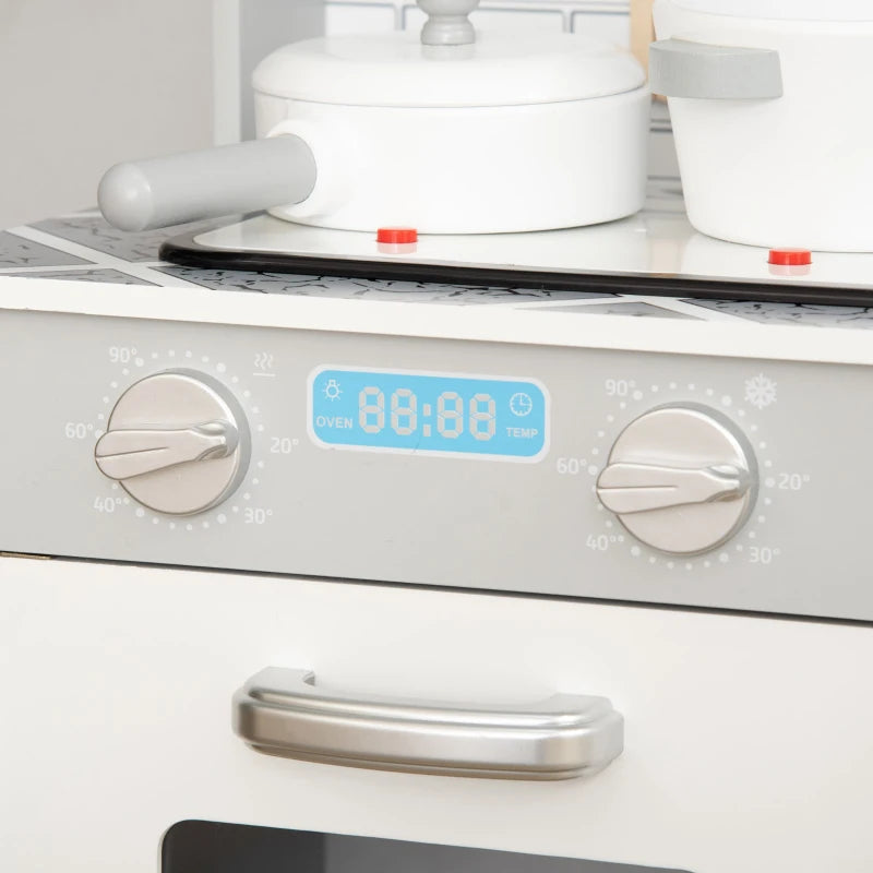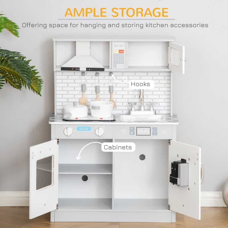 - Safe & Organized: Crafted from E1 grade MDF board, this Nordic-style cooking toy set features rounded edges and is free of sharp burrs, ensuring safety during use. It also offers ample storage space with hooks and cabinets for organization.
