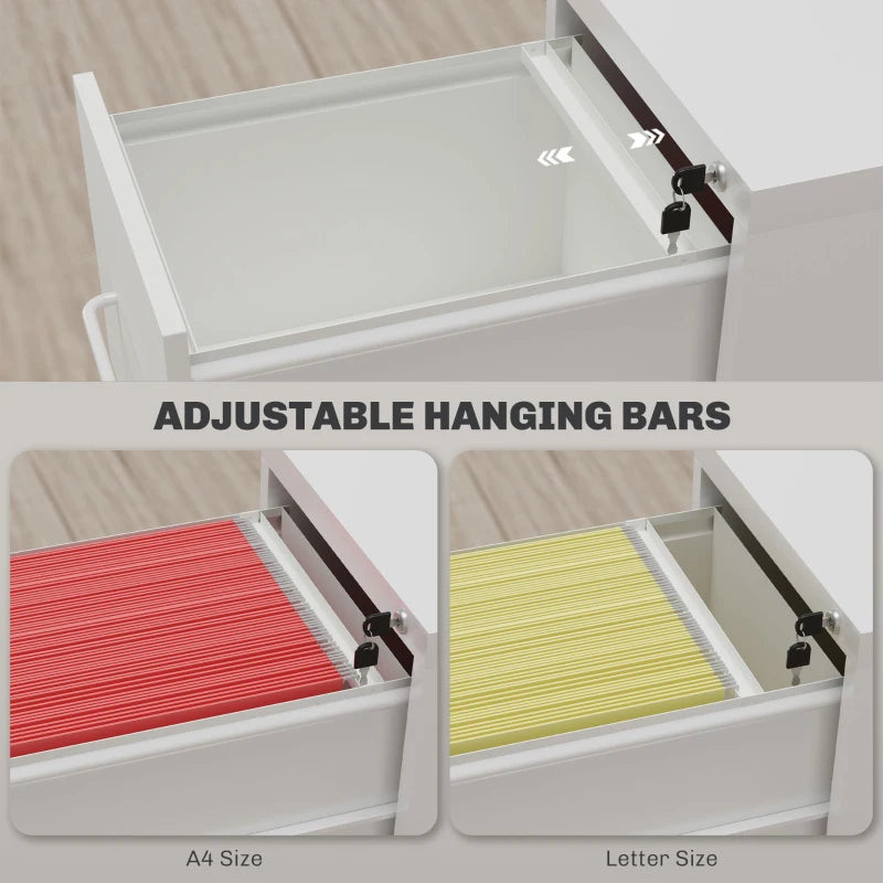 - Three drawers: Ample space for office documents and necessities. Each drawer in this lockable filing cabinet includes an adjustable bar for hanging A4 and letter-sized folders.