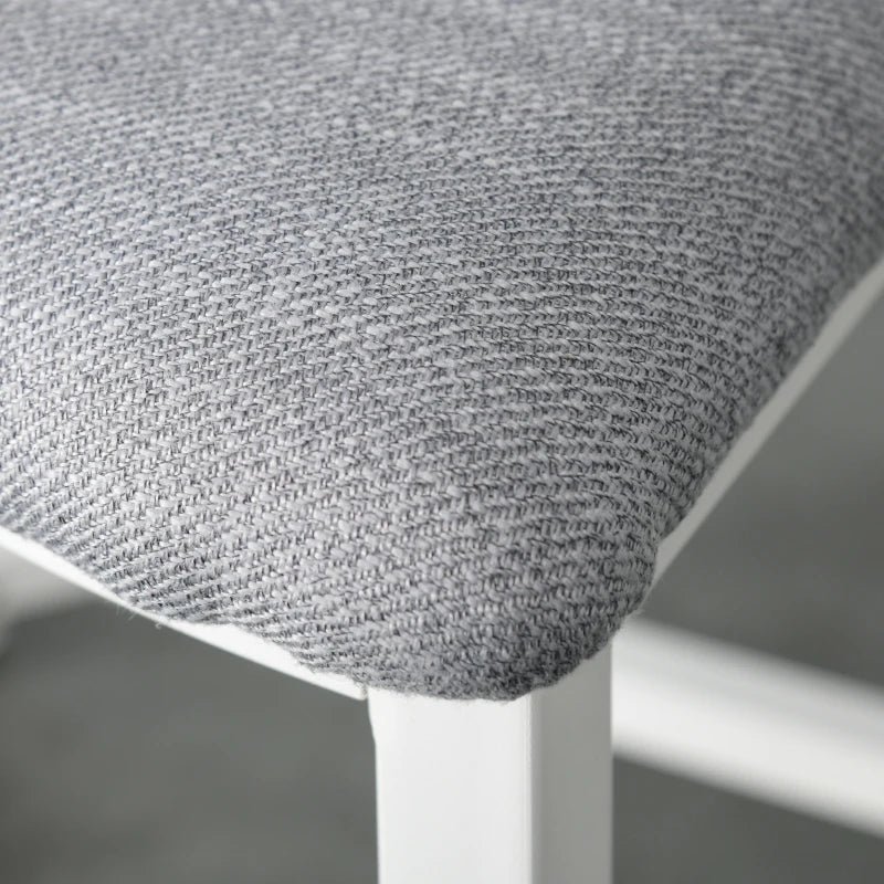 Experience comfortable and space-saving seating with this five-piece dining set, perfect for enhancing your mealtime experiences. It includes four stools and a spacious round table, designed in a contemporary grey and white color palette. The armless stools provide freedom of movement, and their triangular shape allows for easy storage under the table. Each stool is equipped with a padded cushion seat, while the table boasts a sturdy and smooth MDF top. All pieces feature a bottom bar for resting your feet comfortably.