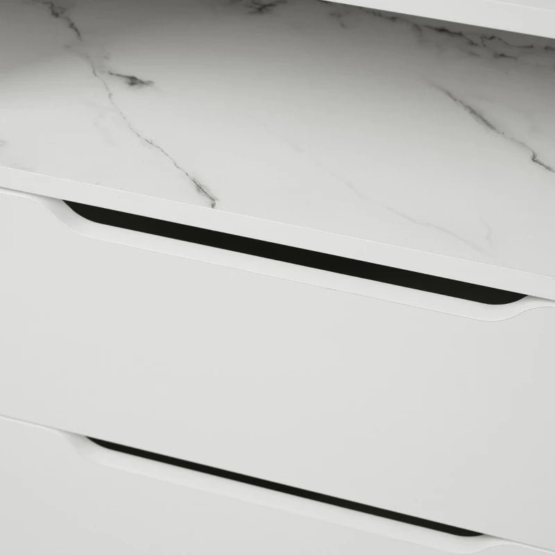 - Modern Marble Aesthetic: This sideboard showcases a chic white finish complemented by sophisticated marble-effect accents, with dimensions of 120L x 40W x 85H cm, making it a fashionable addition to any bedroom, living room, or dining space.