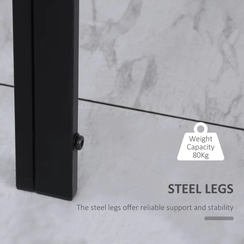 Bring a contemporary touch to your dinner parties, gatherings, and everyday meals with this dining table designed for 4. It features a 6mm tempered glass top for a sleek appearance while providing a solid surface for dining and drinking. Its generous size is perfect for sharing with family or friends. The sturdy steel frame, complemented by square legs, ensures stability, and it comes with plastic pads to protect your floors.