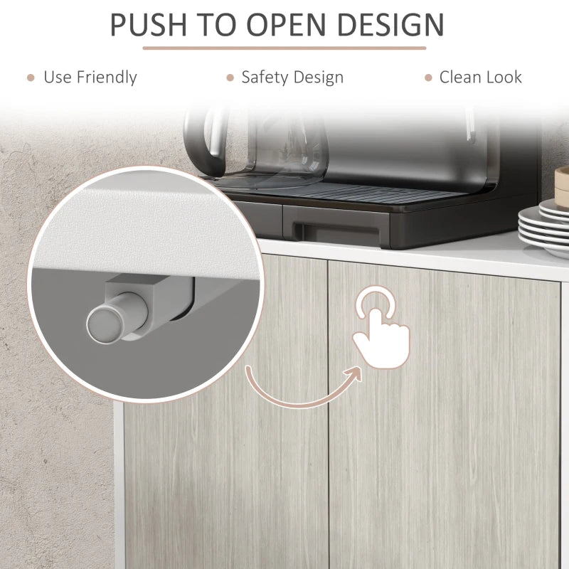 A stylish essential for your home. This storage sideboard not only looks great but also helps keep your space organized. With four doors that reveal a middle shelf in two compartments, it creates four distinct areas perfect for storing dishes, boxes, and more. The flat top is perfect for displaying your favorite items, such as photos and trinkets. The push-open doors add a convenient touch.