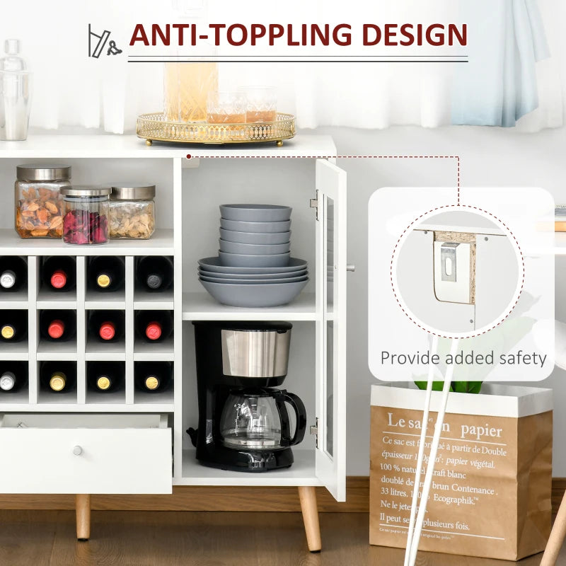 Enhance your home dining storage with this versatile cabinet. It boasts a 12-bottle wine rack, a top shelf, small drawers, and cupboards on both ends, providing ample organization for your space. Each cupboard includes a shelf for added storage. Crafted from particle board, this cabinet is built for everyday use, with five wooden legs ensuring stability. The glass panel doors add a touch of elegance and are easy to open and close.
