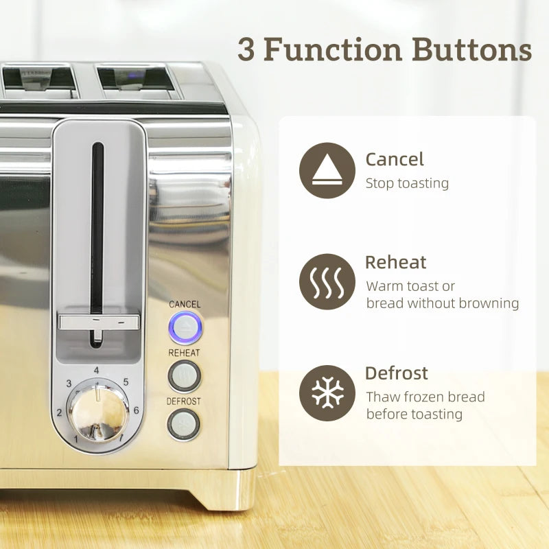 - Four-slice toaster with dual controls. Defrost, reheat, and cancel functions for your convenience