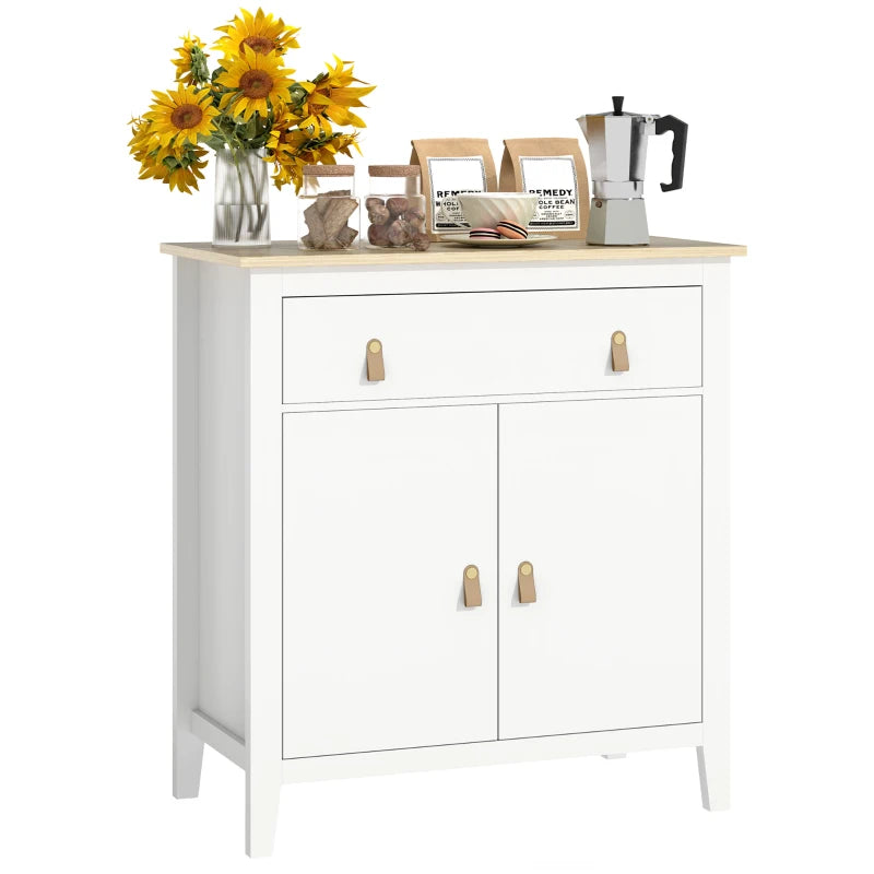 Enhance your home decor with this stylish sideboard. It features a farmhouse design with a colored body and a wood-effect top, complemented by faux leather handles for a distinctive touch. Ideal for use as a kitchen storage cabinet or a living room sideboard, it provides ample storage space with a drawer and a two-tier cupboard featuring adjustable shelving, plus a flat top for additional display and storage.