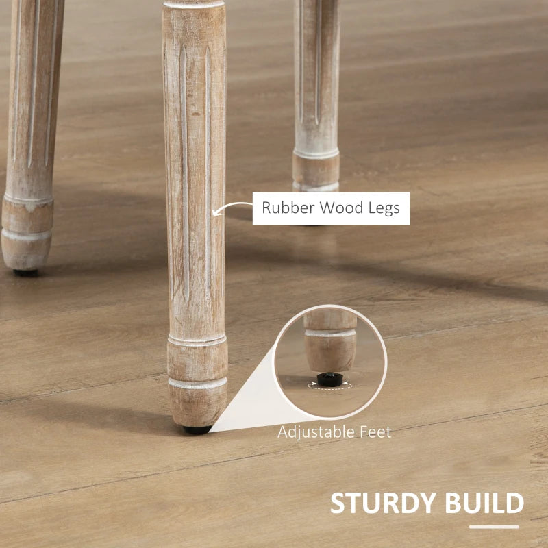 Bring French-inspired sophistication to your home with this set of two dining chairs. Crafted from wood for durability, the oval backs and fluted legs enhance their aesthetic appeal. The thick sponge padding in the back and seat ensures comfort, all covered in smooth linen-look fabric. They also feature adjustable feet for added stability.