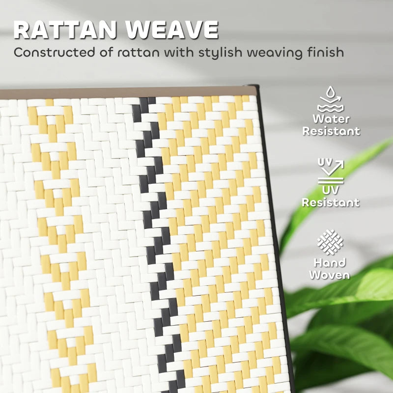 - Rattan seating: Crafted from handwoven plastic wicker rattan for an elegant garden aesthetic. Durable and designed for outdoor use. Features a high back and armrests for added support.