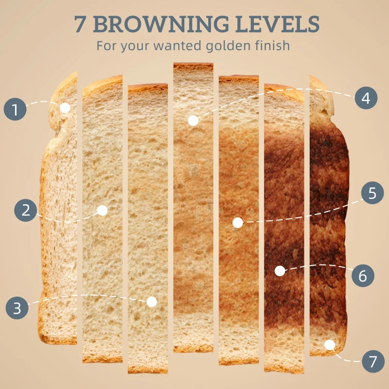 - 1080W seven-level toaster: Toast your bread to perfection with this two-slice toaster that features defrost, reheat, and cancel functions. The wide 3.5 cm slots accommodate thick bread, auto-centering for even toasting, and it pops up when ready.
