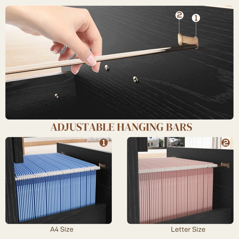 - Two-level hanging bars: Each drawer of this wooden filing cabinet is equipped with hanging bars to keep files organized, tidy, and easily accessible.