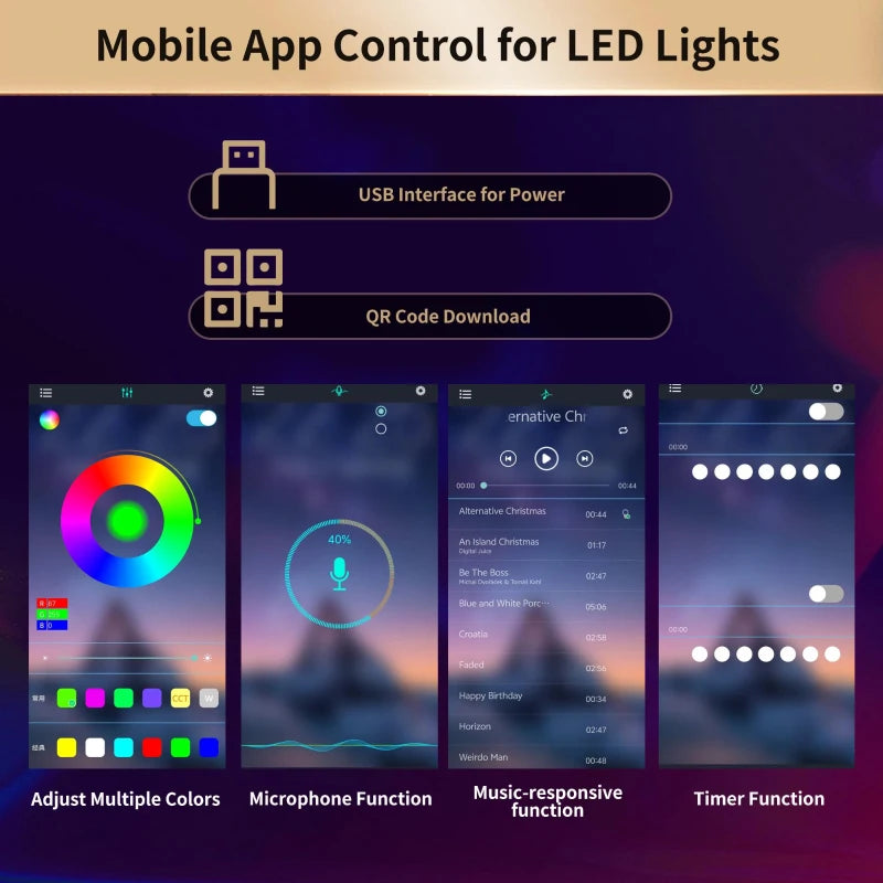 LED Lighting: App-controlled adjustable colour LEDs with music synchronisation