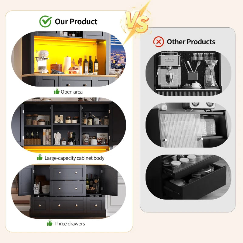 Generous storage options: Includes an upper cupboard with built-in shelves, a spacious open central section ideal for coffee machines, vases, or wine accessories, and lower cupboards with five drawers to keep your kitchenware and household items neatly organised.