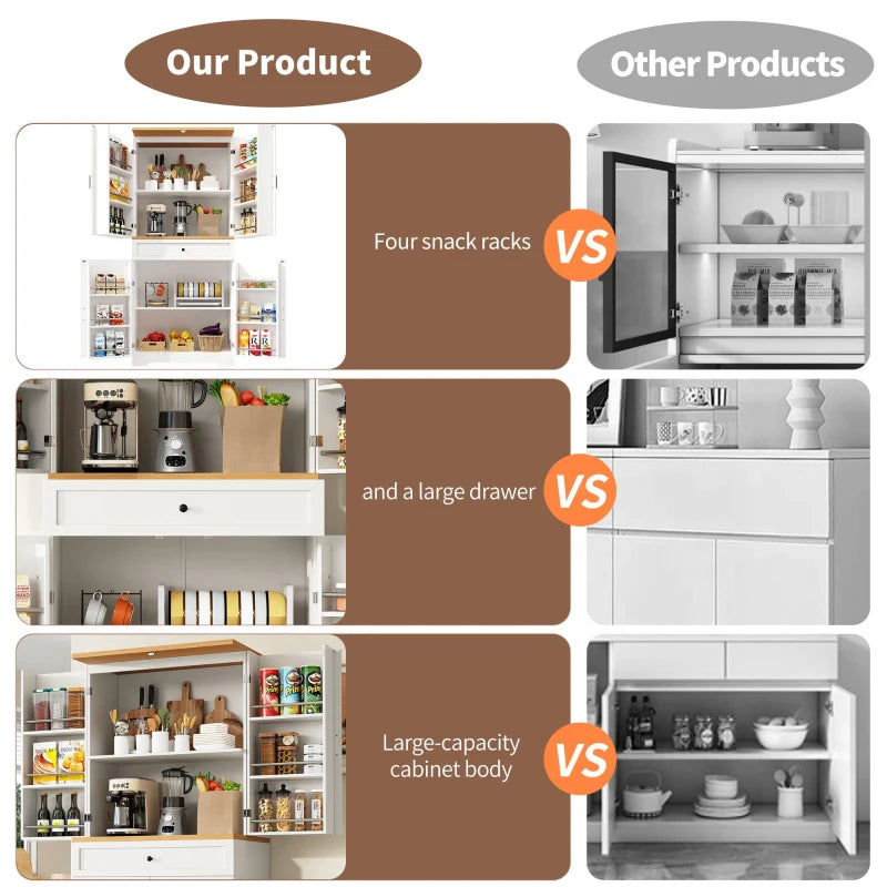 Generous storage capacity: Includes upper and lower double-door cabinets, middle drawers, and door-mounted racks, perfect for plates, utensils, bottles, and other kitchen items.