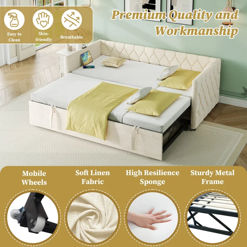 Enhance your living area with this adaptable upholstered daybed, suitable for any room in your home. This chic piece easily transforms between a sofa, daybed, and trundle bed, providing versatility and comfort for any situation. With built-in USB and Type-C ports, you can conveniently charge your devices while enjoying the plush, button-tufted linen upholstery. Featuring straightforward assembly and a stylish beige finish, this daybed is a functional and elegant addition to your home decor.