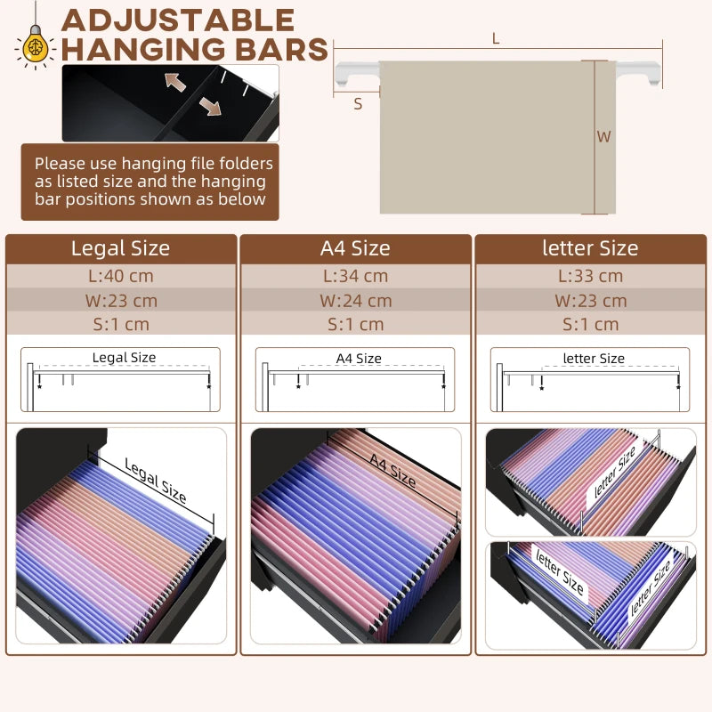 - Adjustable hanging bar in the bottom drawer for letter, A4, and legal-sized files